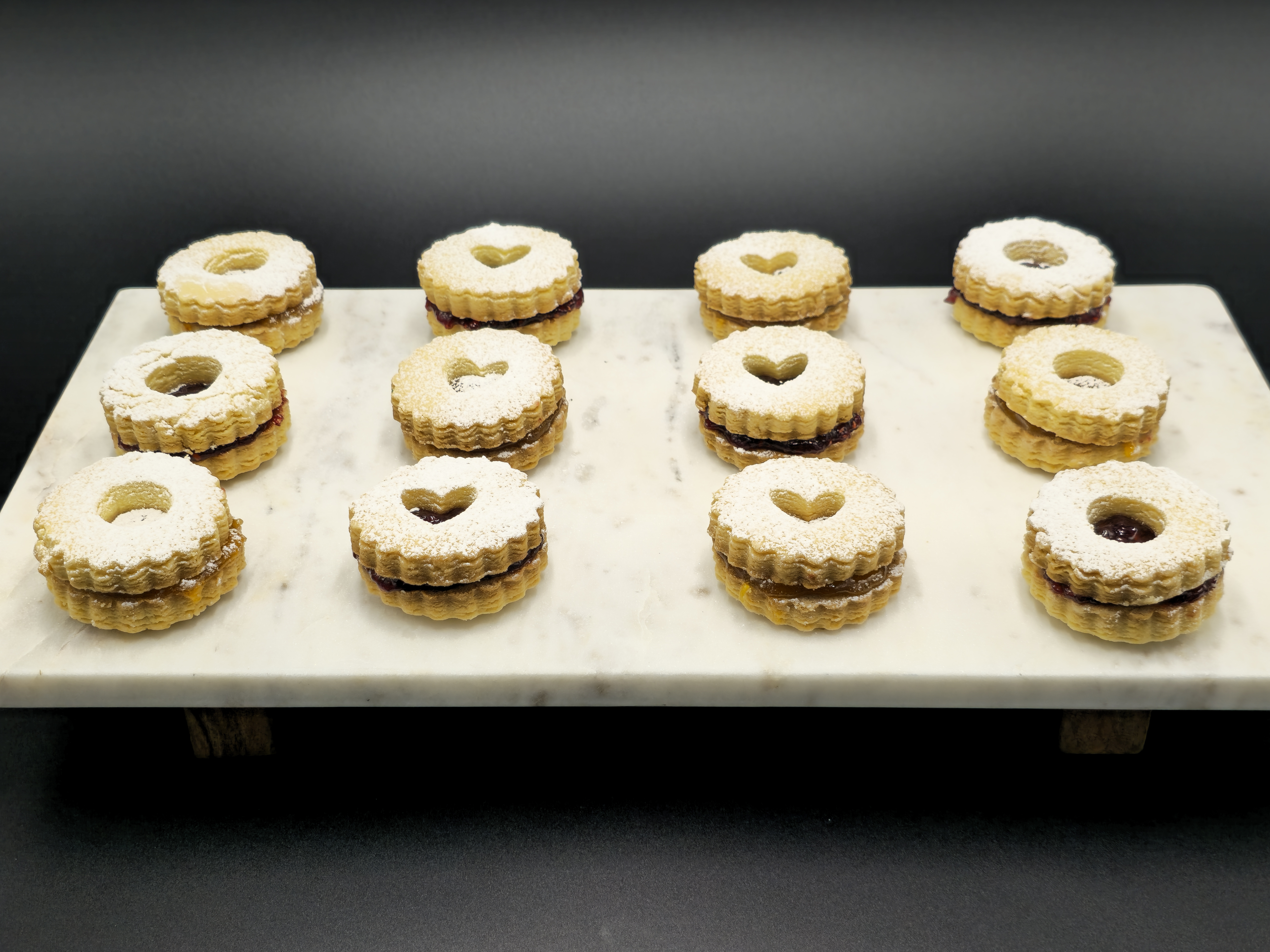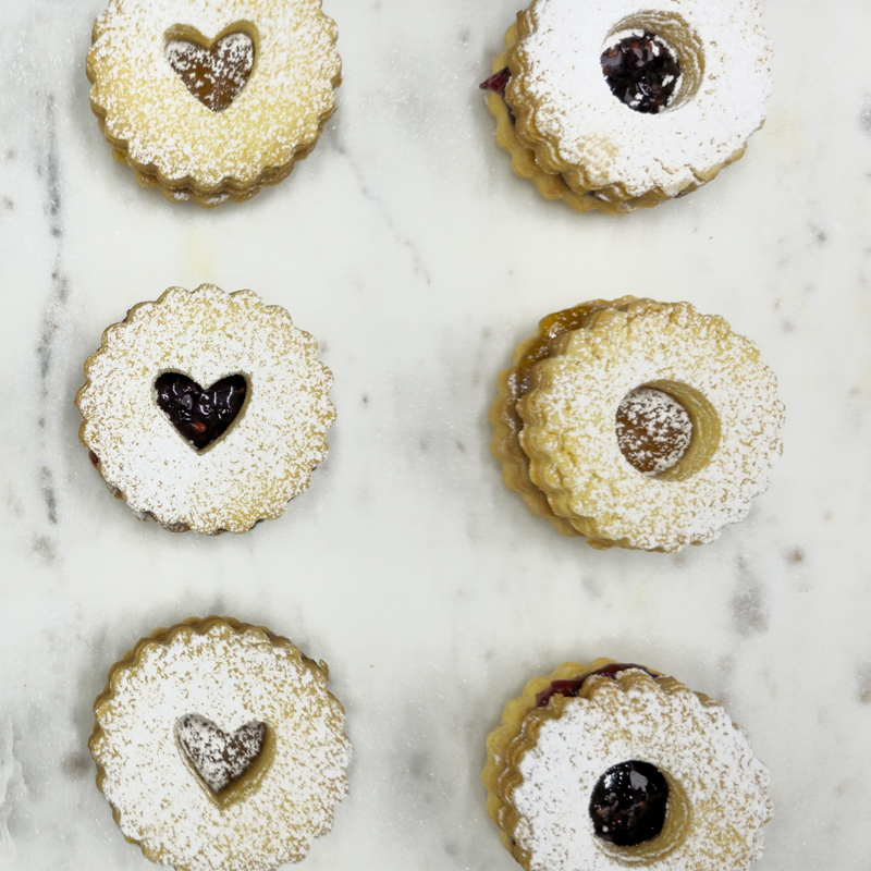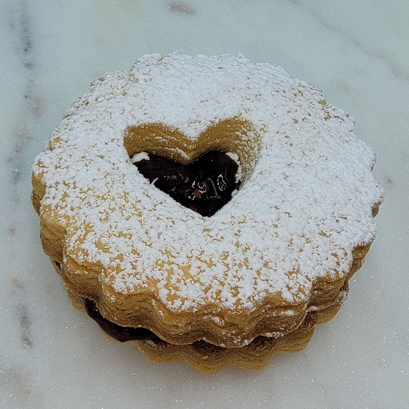 A timeless classic with a Scottish twist, our Linzer shortbread cookies pair two layers of tender, buttery shortbread with a jewel-like center of raspberry or apricot preserves. Lightly dusted with powdered sugar, they offer a perfect balance of sweetness and elegance. Whether enjoyed with a cup of tea or presented as a gift, these cookies are as visually stunning as they are delicious.